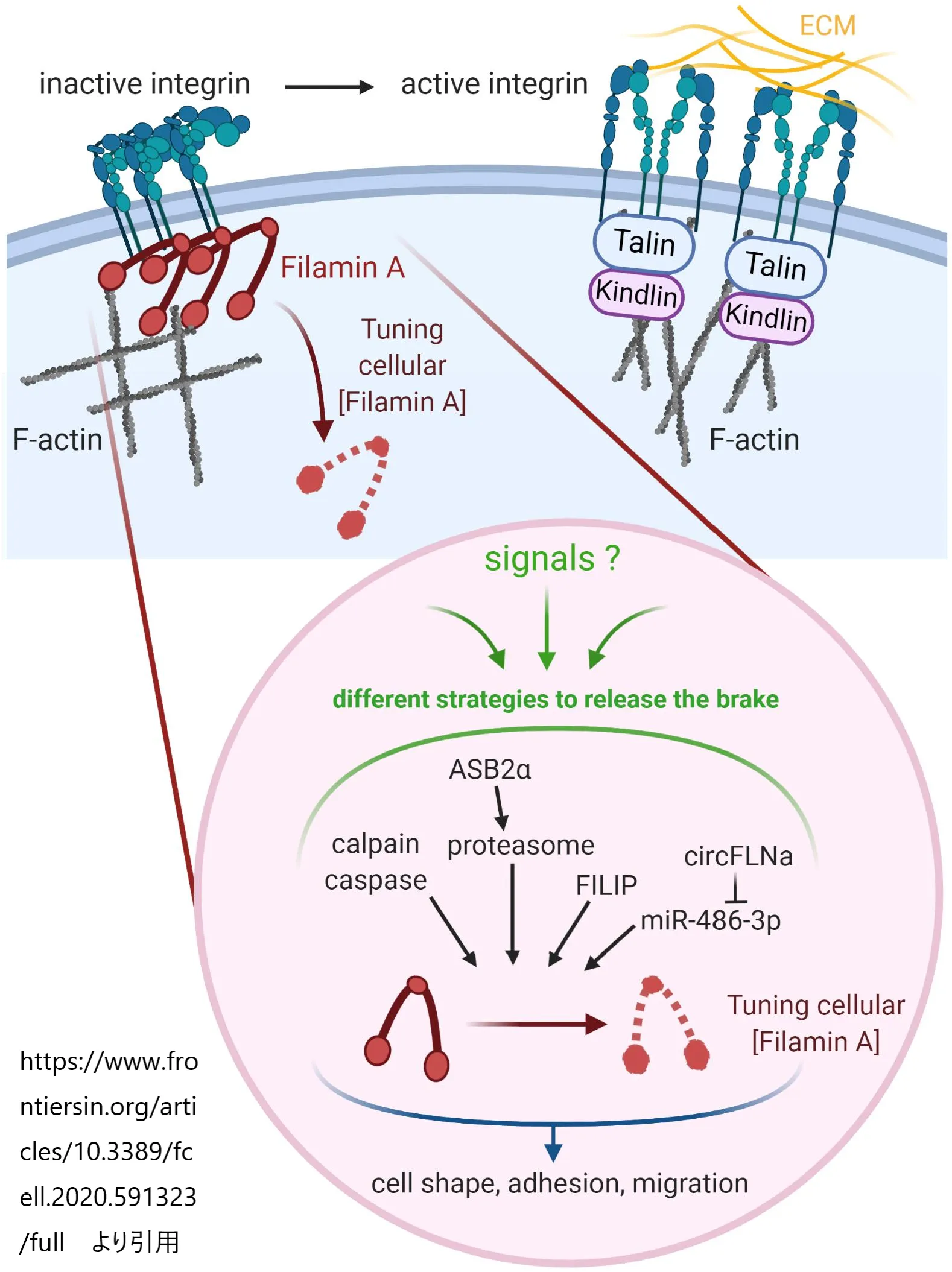 このように、フィラミンAは細胞内のアクチン細胞骨格の構造と力学的性質を制御するための重要なハブとして機能し、細胞の形態や動きに直接影響を与える多くの生物学的プロセスに関与しています。