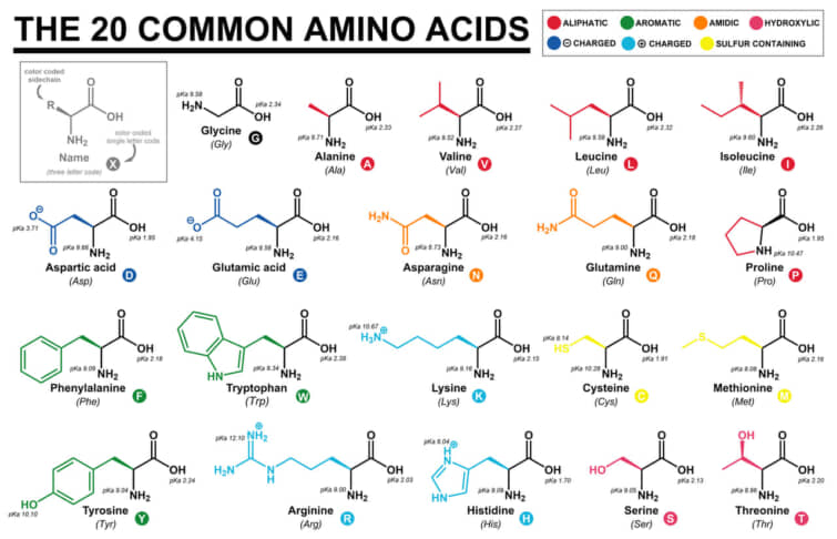 以下に、タンパク質の中で最も一般的な20種類のアミノ酸を、3文字と1文字のコードとともに示します。
