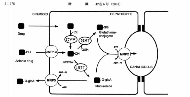 OATP-C: organic anion transporting polypeptide-C, UGT: UDP-glucuronosyltransferase (glycosyltransferase), GST: glutathione S-transferase, UDPGA:uridine diphospho-glucuronic acid, GSH: reduced glutathion