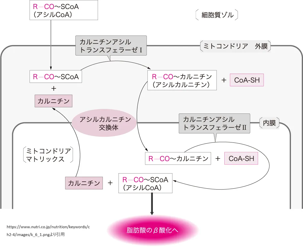 カルニチンは、パルミトイルCoAをミトコンドリアに輸送し、脂肪酸の酸化を促進する役割を持っています。カルニチン欠乏症は、エネルギー代謝に影響を与えるため、カルニチンの補充による治療が行われています[12]。将来的には、パルミトイルCoAの代謝を改善することで、栄養学的介入や健康維持に役立つ可能性があります。