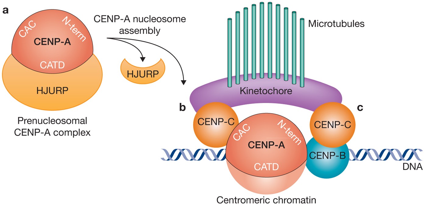 CENP-Aのヌクレオソームは、DNA複製と一緒にロードされることはなく、異なる生物で異なる細胞周期段階でロードされます。例えば、ヒトではG1期、ショウジョウバエではM期、S. pombeではG2期にロードされます。この特殊なロードを調整するために、CENP-A特有のヒストンシャペロンが存在します。ヒトではHJURP、ショウジョウバエではCAL1、S. pombeではScm3です[3]。