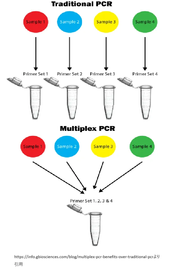 マルチプレックスPCR(Polymerase Chain Reaction)は、一度のPCR反応で複数の異なるDNAターゲットを同時に増幅する技術です。この方法は、異なるプライマーセットを使用して一つの反応ミックスで複数の遺伝子領域を同時に検出・定量することが可能です。