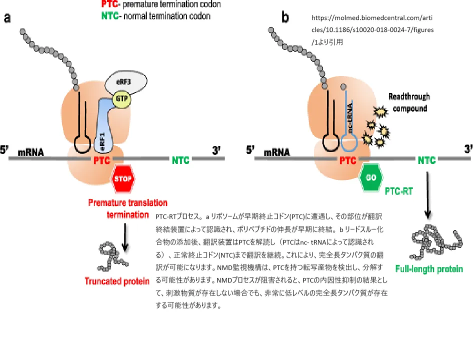 リードスルー療法の基本的な原理は、リボソームがmRNAを翻訳する際にストップコドンの位置で読み飛ばしを促進することです。これにより、リボソームがストップコドンを無視してタンパク質の合成を続行し、完全な形のタンパク質が生成される可能性があります。このプロセスを効果的に行うためには、アミノグリコシド抗生物質のような特定の化合物が用いられます。