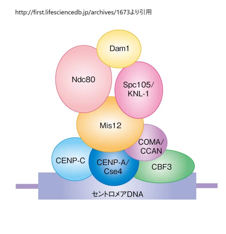 染色体のセントロメアに特異的なヌクレオソームによって動原体の位置が決まり、セントロメア特異的タンパク(centromere-specific proteins, CENPs)が会合し、動原体形成が始まります。