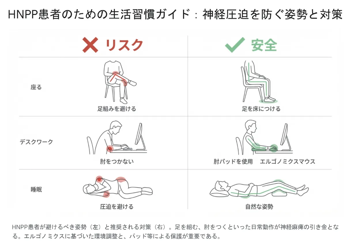 【結論】 HNPPには根本的な治療法は存在せず、管理の中心は神経圧迫の予防(生活指導・エルゴノミクス)と症状に応じた対症療法です。患者自身が疾患を理解し、リスク行動を回避することが最も効果的な「治療」となります。