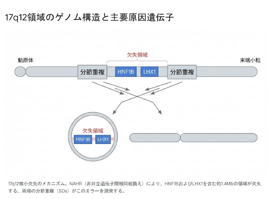 【結論】 本症候群は、17q12領域にある約15個の遺伝子がまとめて失われることで発症します。特にHNF1B(腎・膵臓形成のマスター遺伝子)とLHX1(脳・生殖器形成に関与)の2つの遺伝子の機能不全(ハプロ不全)が、多様な症状の主原因です。