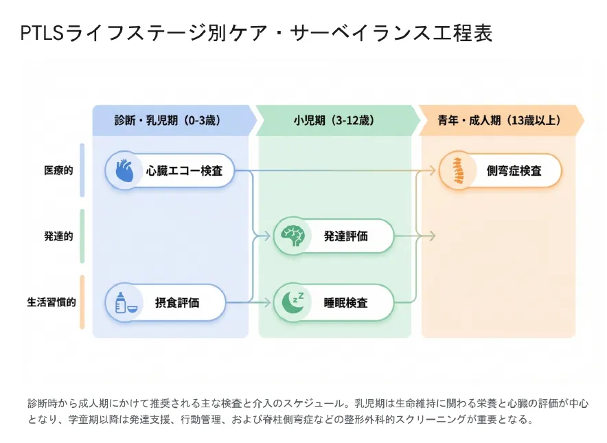 【結論】 PTLSに対する根本的な遺伝子治療法は現時点ではありません。しかし、早期療育(PT/OT/ST)や心臓・睡眠の問題への医学的介入によって、予後やQOL(生活の質)を大きく改善することが可能です。