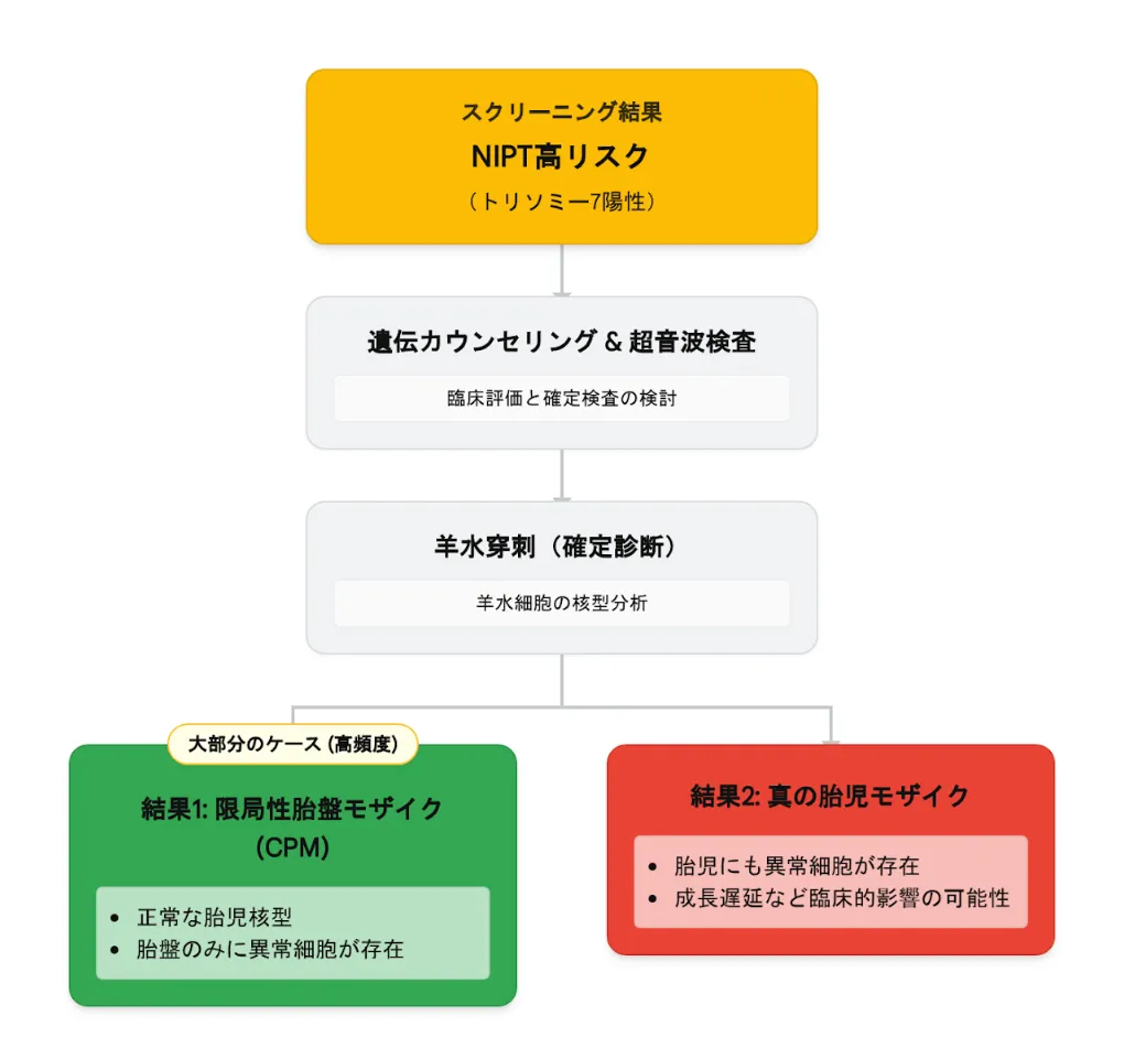 7番染色体のトリソミーがNIPTで陽性となった場合、その大部分は「限局性胎盤モザイク(胎盤にのみ異常があり、赤ちゃんは正常)」であることが判明しています。結果だけでパニックにならず、羊水検査で確定診断を行うことが極めて重要です。