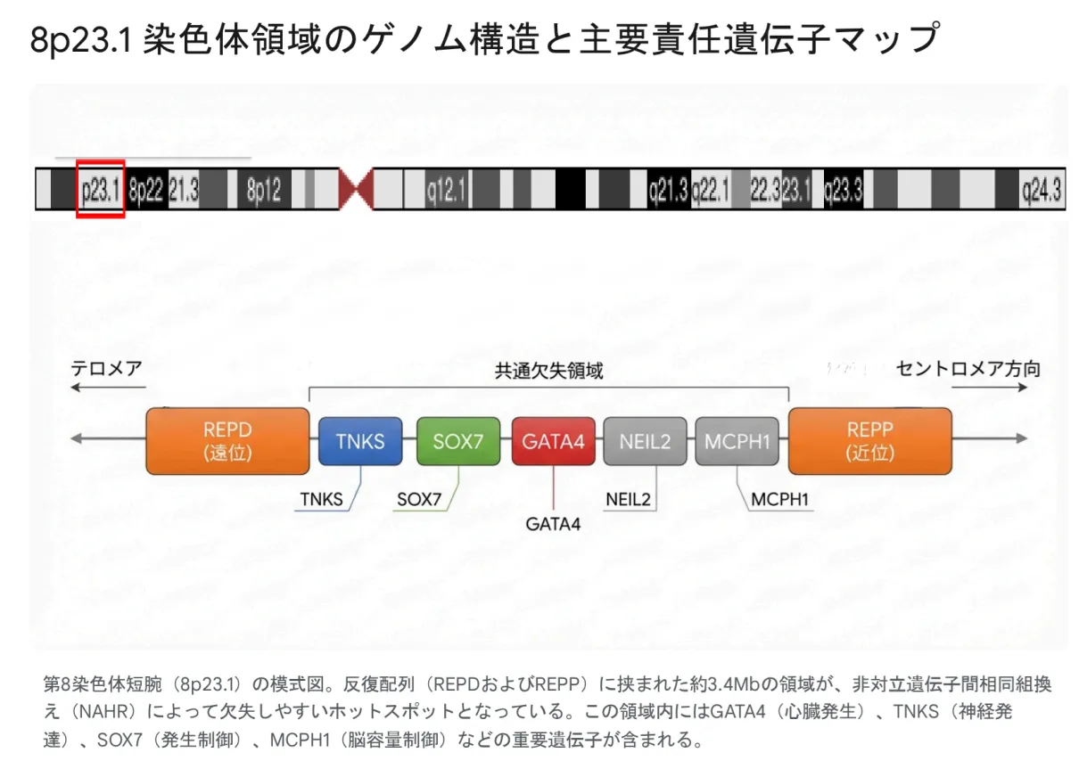 【結論】 8p23.1微細欠失症候群(8p23.1 microdeletion syndrome)は、第8染色体短腕の8p23.1領域(約3.4〜5Mb)が欠失する染色体微細構造異常です。先天性心疾患を高頻度で合併することが最大の特徴であり、心臓発生のマスター転写因子であるGATA4遺伝子のハプロ不全がその主因です。