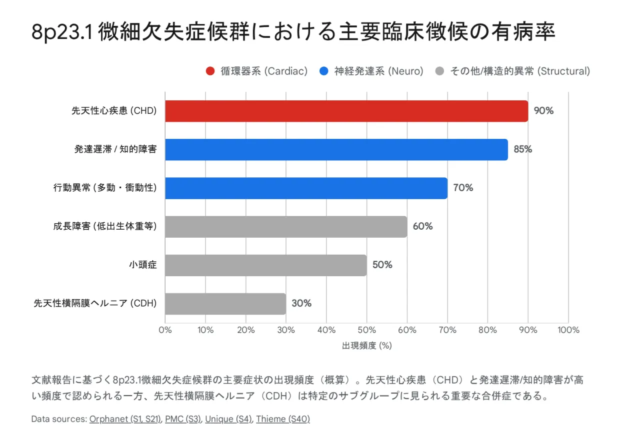 【結論】 本症候群の最も重要な症状は先天性心疾患(80〜90%)であり、次いで発達遅滞(85%)、先天性横隔膜ヘルニア(20〜30%)が高頻度で認められます。ただし、症状の現れ方には個人差が非常に大きいことが特徴です。