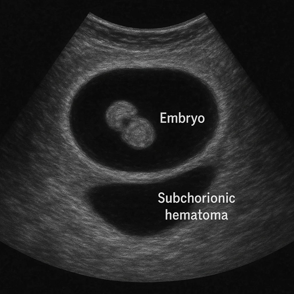 絨毛膜下血腫は、妊娠初期に絨毛膜(胎盤の外側の膜)と子宮内膜の間に血液が溜まる状態を指します。超音波検査で胎嚢周囲に無エコーまたは低エコー像として確認されることが多く、妊娠初期の出血の主な原因の一つです。