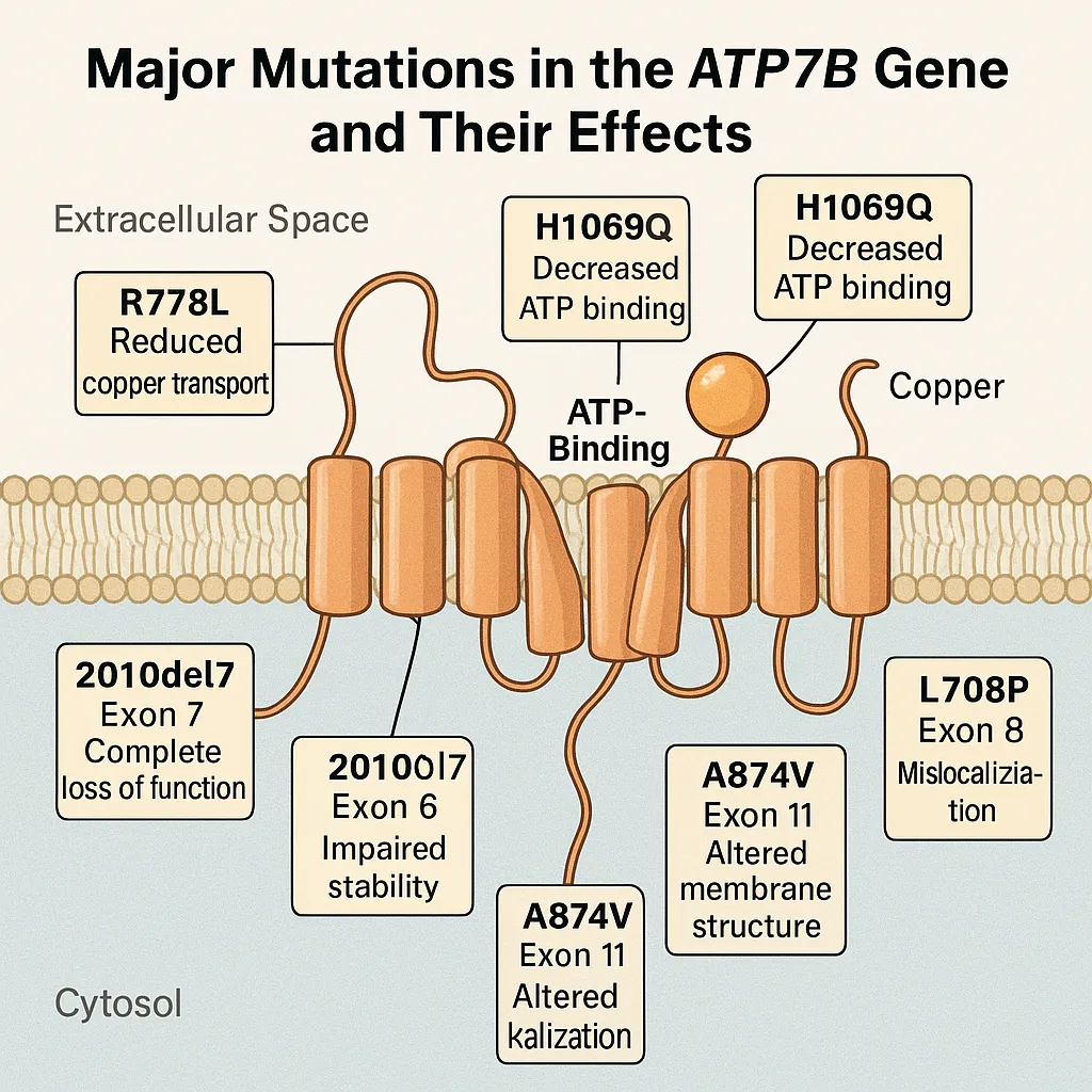 - M645R変異(エクソン6):スペイン人患者で高頻度(約55%)に見られ、6番目の銅結合ドメインと最初の膜貫通領域の間に位置しています。主に肝臓型のウィルソン病と関連しています。