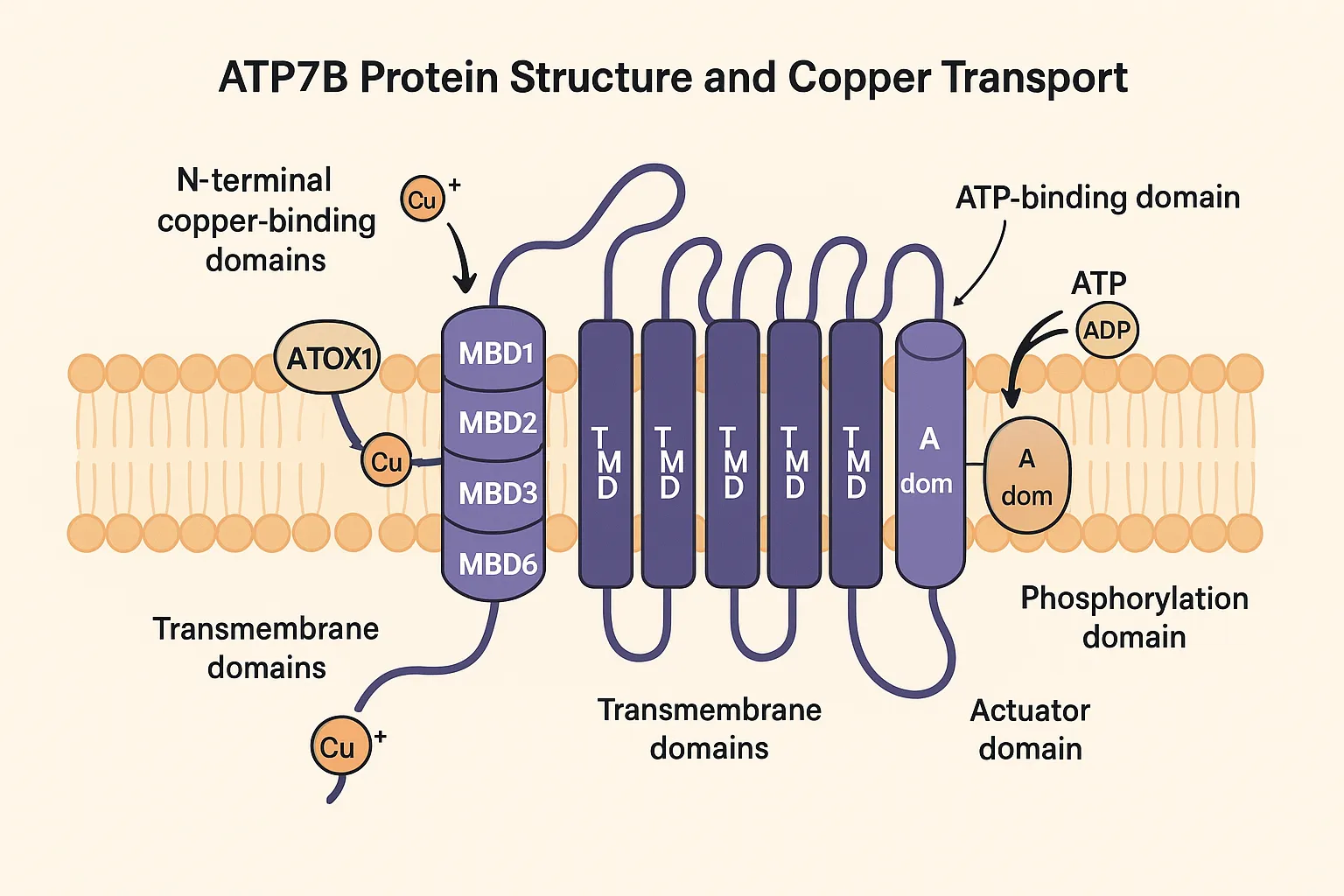 ATP7B遺伝子がコードするタンパク質は1,465アミノ酸からなり、複数の機能ドメインを持つ複雑な構造をしています。