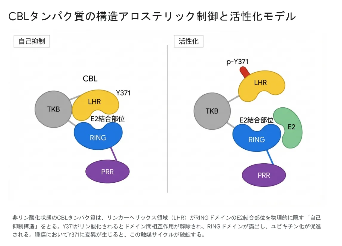 この2段階変異メカニズムは、「がん抑制遺伝子としてのCBL」の側面を示すものです。