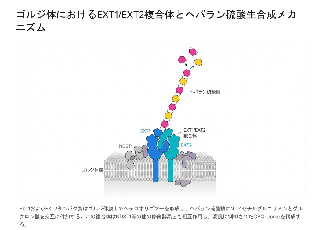 細胞内のゴルジ体において、EXT1タンパク質は単独で働くのではなく、EXT2タンパク質と強固なヘテロオリゴマー複合体を形成します。この複合体は、NDST1等の他の修飾酵素とも物理的に近接して相互作用し、「GAGosome(ガグオソーム)」と呼ばれる巨大な多酵素超複合体を形成します [cite: 2]。