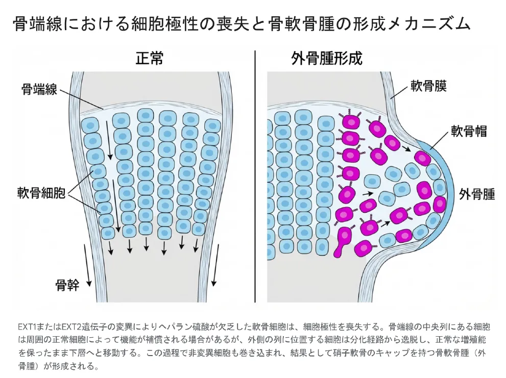 歴史的に本疾患は「多発性軟骨性外骨腫(Multiple cartilaginous exostoses)」「骨幹端全域異常(Diaphyseal aclasis)」「遺伝性変形性軟骨異形成症(Hereditary deforming chondrodysplasia)」あるいは「Ehrenfried病」など、多数の同義語で呼称されてきた背景があります。しかし、近年の病理学的および分子生物学的な理解の目覚ましい進展により、形成される病変が単なる骨の出っ張り(Exostosis)ではなく、表面に「硝子軟骨のキャップ(軟骨帽)」を有し、正常な骨の成長と同じ「内軟骨性骨化」のプロセスを伴って成長する真の腫瘍性病変(Osteochondroma)であることが明らかとなりました。