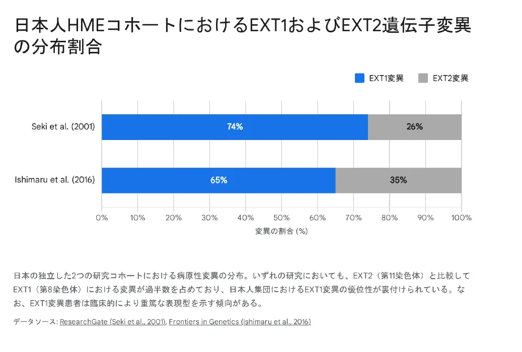 なお、現在の標準的な遺伝子検査(全エクソームシーケンス等)を駆使しても、全患者の約4%から最大33%においてEXT1またはEXT2の病原性変異を特定できない「分子学的に未診断の症例」が存在します。これらに対しては、染色体19p領域に連鎖する未同定の第3の原因遺伝子(EXT3)の存在、発生初期の体細胞モザイク現象、あるいは標準検査では検出不可能な深部イントロン領域の制御バリアントの存在などが強く示唆されており、現在も活発に研究が進められています。