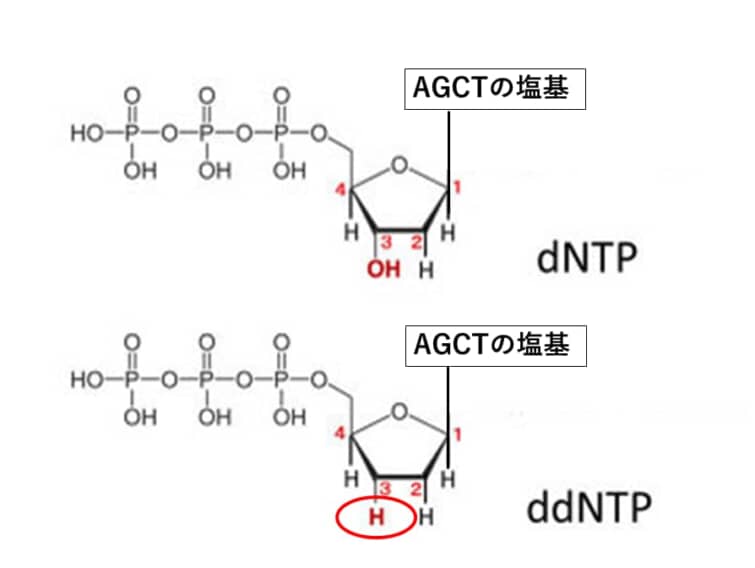 ddATPとはdATPの3’部位のヒドロキシ基(-OH)がデオキシ(酸素が取れること)されて水素に置換された構造をもっています。DNAの新規合成ではDNA鎖の3’末端のヒドロキシ基とdNTPの5’リン酸基がリン酸結合によってつながるのですが、ddATPがDNA鎖に取り込まれると、OHではなくHなのでリン酸基と結合することが出来ません。このためその先に伸長することができなくなり、相補鎖の合成はddATP と結合した長さで停止します。