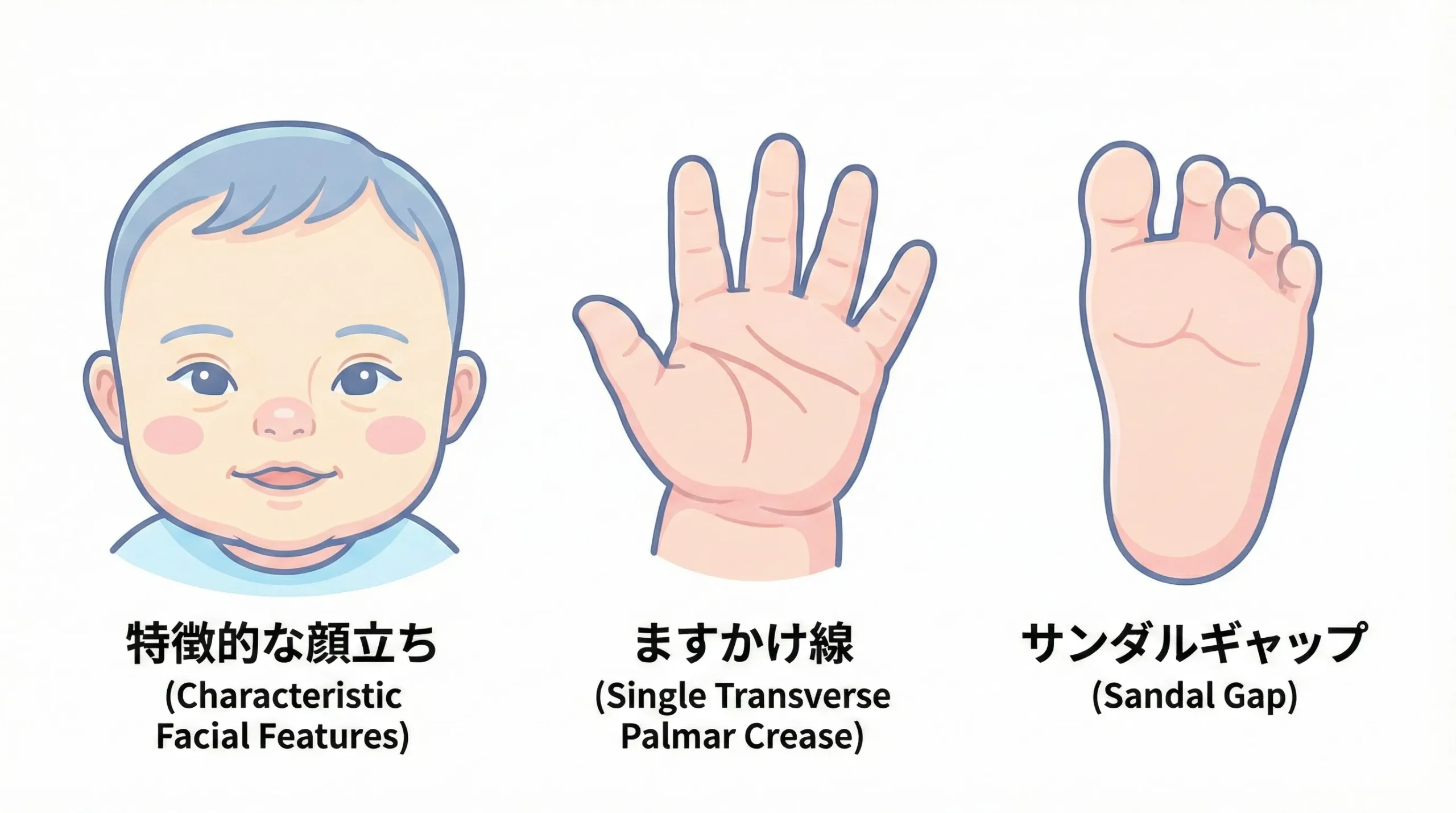 • 特徴的な顔貌と身体つり目、低い鼻根、猿線(手相)など、新生児期から見られる特徴をイラストで解説します。