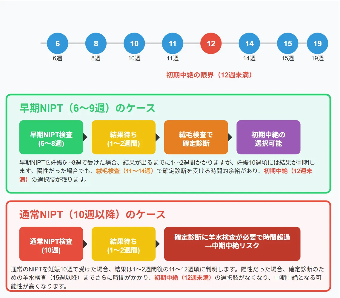 早期NIPTの大きな意義は、検査結果から確定診断、そして場合によっては中絶の判断までの時間的余裕を持てることにあります。以下のタイムラインで、早期NIPTと通常のNIPTの違いを示します。