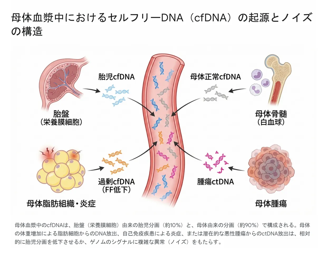 母体血漿中のcfDNAは、胎盤(栄養膜細胞)由来の胎児分画(約10%)と、母体由来の分画(約90%)で構成されます。図が示すように、お母さんの体重増加による脂肪組織からの過剰なDNA放出や、自己免疫疾患による炎症、そして潜在的な悪性腫瘍(がん)からのctDNA放出は、相対的に胎児分画を低下させるか、ゲノムのシグナルに複雑な異常(ノイズ)をもたらす原因となります。