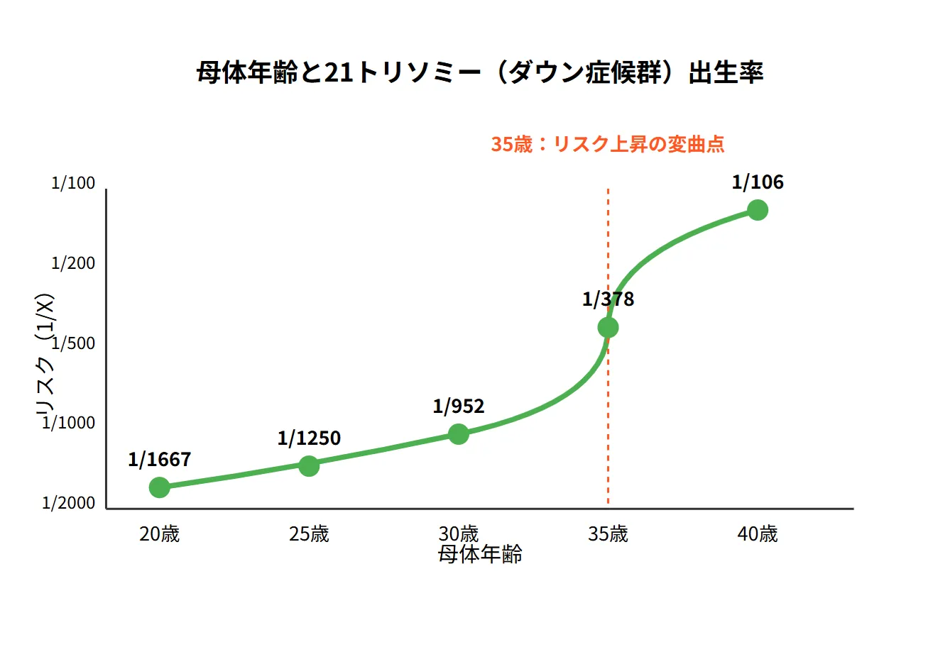 35歳を境に染色体異常のリスクが急激に上昇します。例えば、21トリソミー(ダウン症候群)の出生率は以下のように変化します: