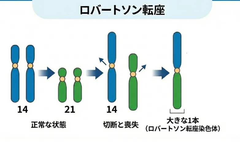 本来は別々にあるはずの2本の染色体(例:14番と21番)が、根元でくっついて「大きな1本」になってしまった状態です。