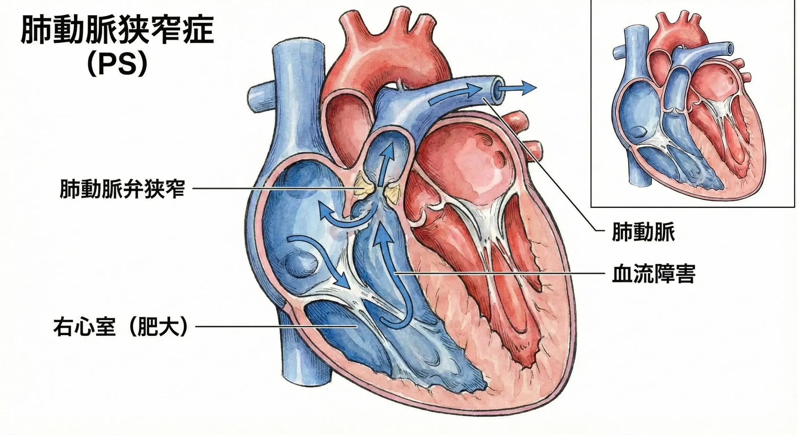 肺動脈流出路が狭くなることで右室から肺動脈への血流が妨げられている状態となる病気です。右心室から先天性心疾患の8~10%を占めると言われている比較的多い疾患です。