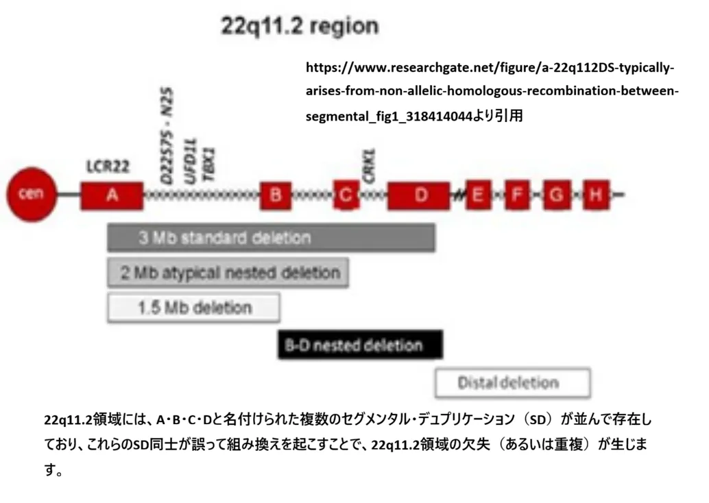 【結論】 22q11.2欠失の臨床像の中心にはTBX1(転写因子)を含む遺伝子群のハプロ不全が関与します。欠失は、22q11.2領域にある反復配列(SD/LCR)同士の誤った組み換えで起こりやすいことが知られています。